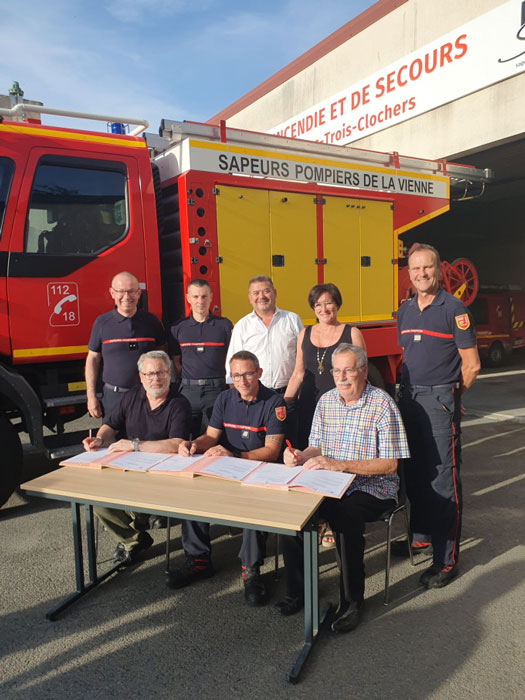 Temps fort de cette rencontre : la signature d’une convention de disponibilité entre un sapeur-pompier volontaire, Antoine Braguier maire de sa commune et Benoit Coquelet président du SDIS 86.