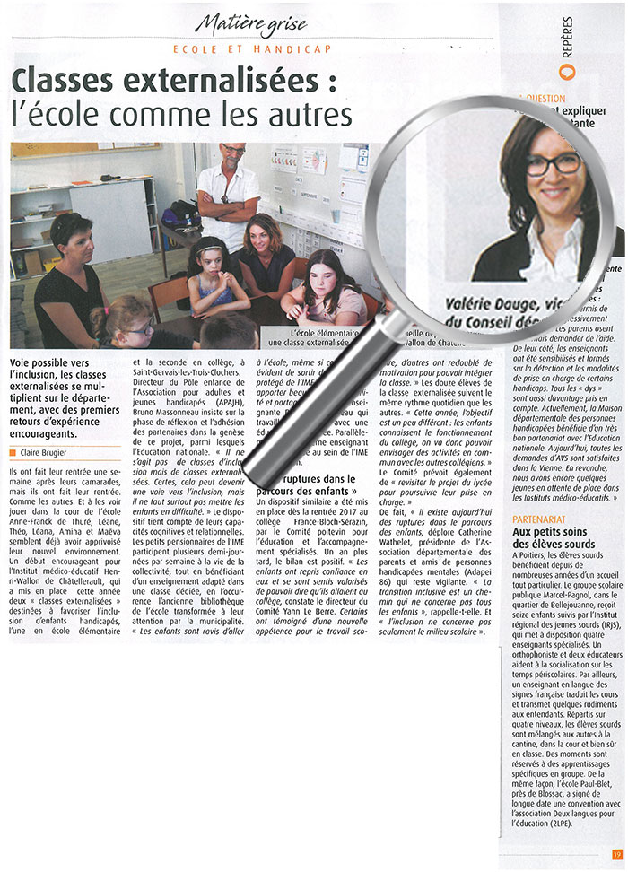 Suite à la volonté d’intégrer plus largement en milieu ordinaire les enfants en situation d’handicap, il est mis en place à cette rentrée l’intégration d’une classe de l’IME Pierre Garnier de Châtellerault sur le modèle de l’expérience réussie au collège France Bloch Sérazin.
